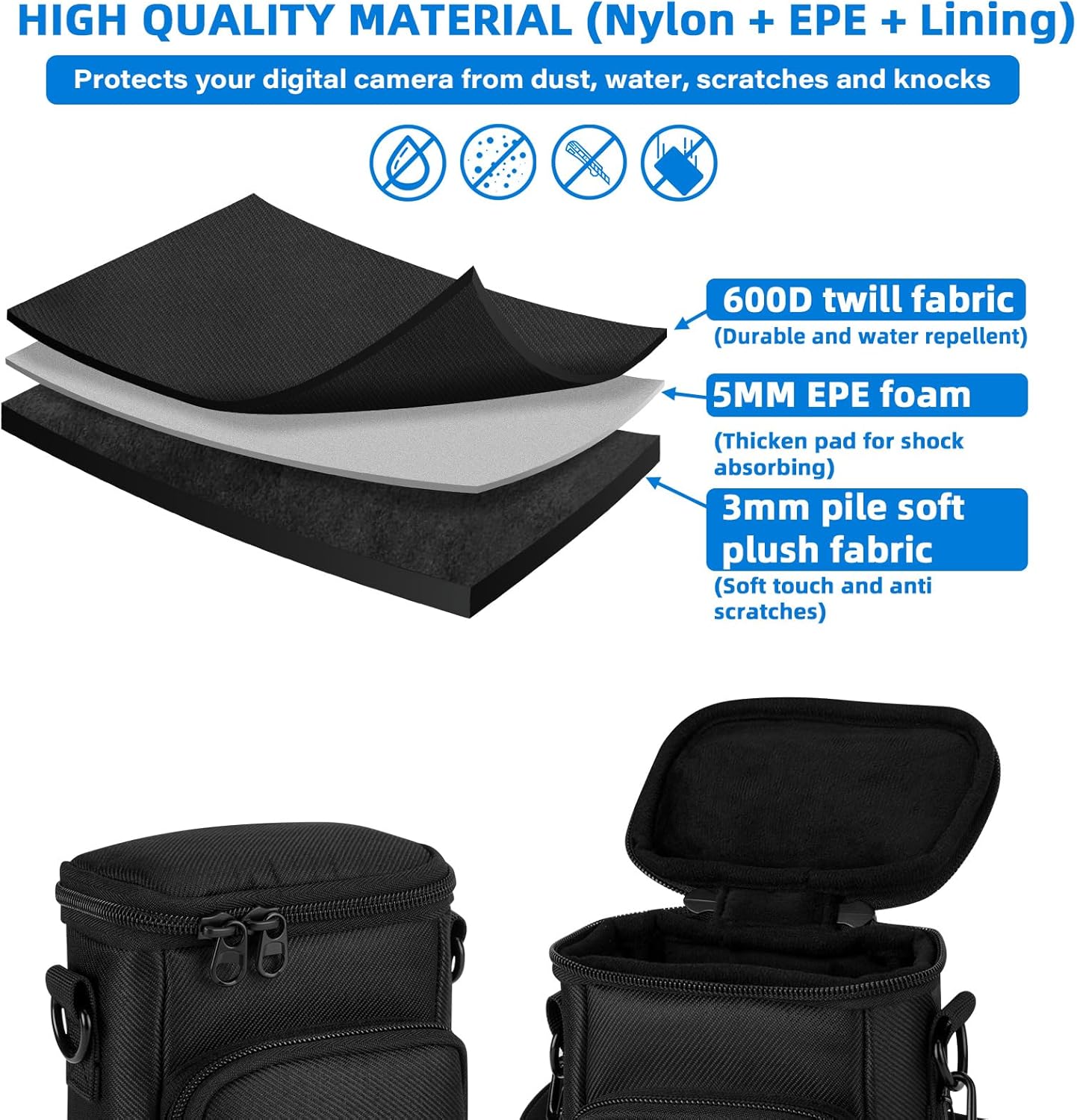L’étui de protection rembourré pour appareil photo est fabriqué à partir de tissu sergé 600D avec un intérieur en velours super doux et est doublé de mousse EPE de 5 mm.