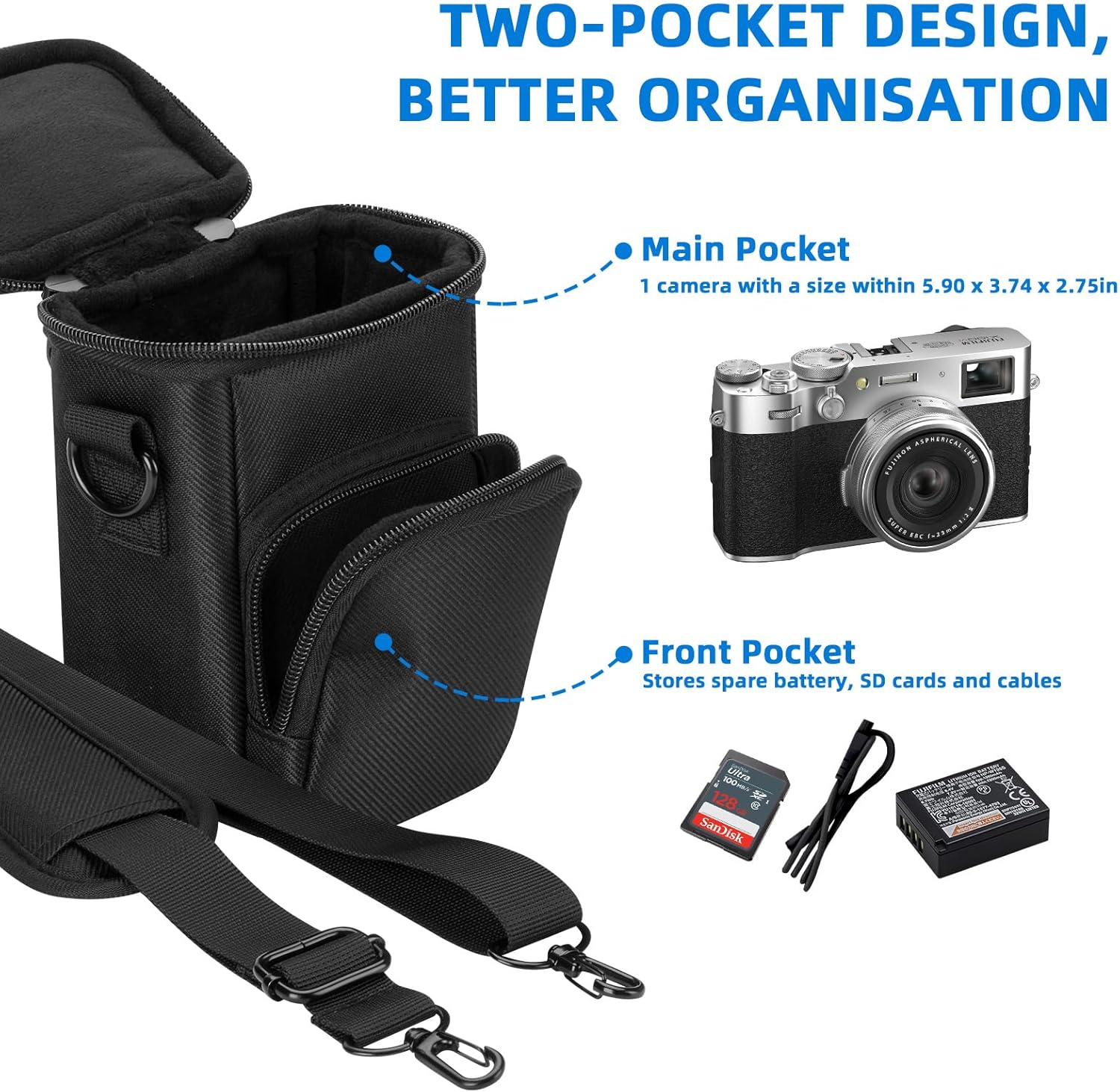 【Bien organisé】 Conception à 2 compartiments, suffisamment d’espace pour mieux organiser votre appareil photo numérique et vos accessoires. Petite poche avant pour la batterie et le câble Li-Ion Fujifilm NP-W126S, permet de remplacer facilement la batterie de l’appareil photo en voyage.