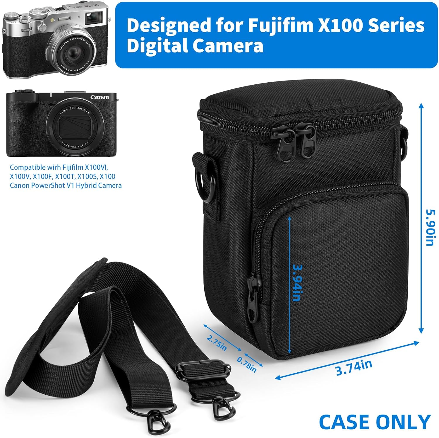 Ajustement parfait : coque uniquement. (L’appareil photo numérique et les accessoires ne sont pas inclus). Dimensions internes : 5,90″ x 3,74″ x 2,75″. Cet étui de protection pour appareil photo est spécialement conçu pour l’appareil photo numérique Fujifilm X100V/X100VI/X100F/X100S, compatible avec l’appareil photo hybride Canon PowerShot V1. Remarque : pour les autres appareils photo, veuillez mesurer votre appareil photo avant l’achat.