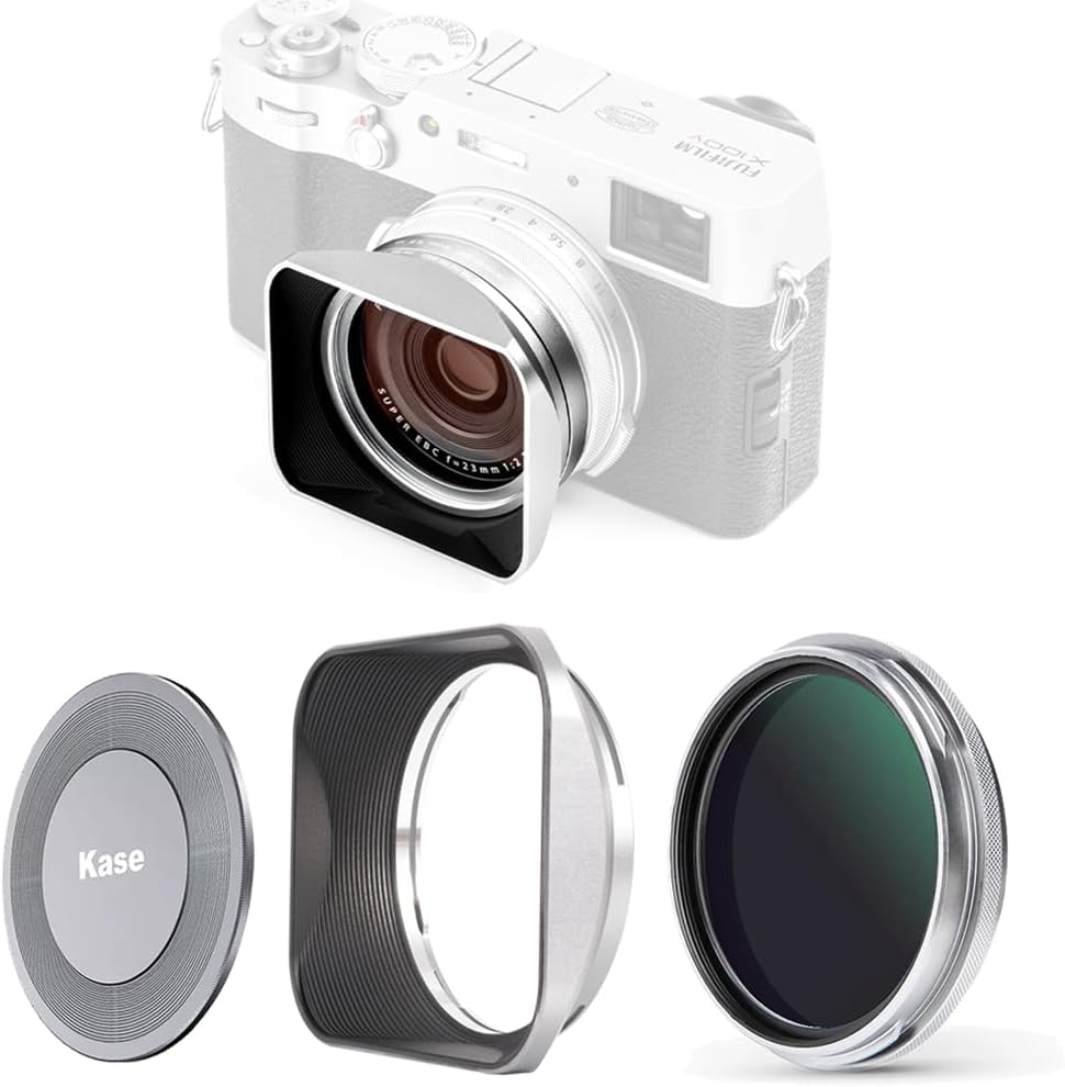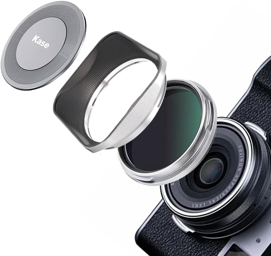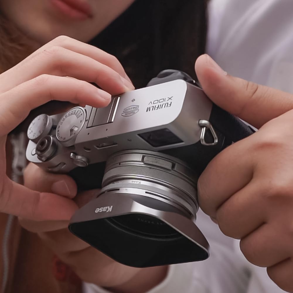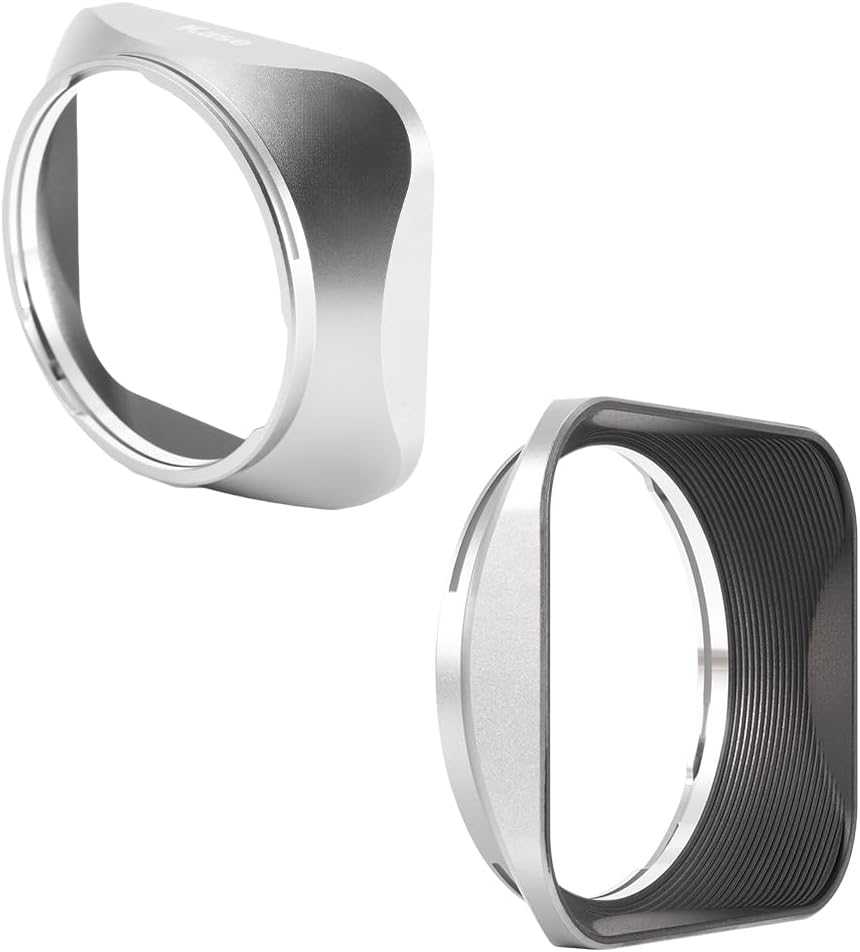 Pare-soleil carré : le pare-soleil carré s’harmonise avec le style rétro de l’appareil photo, l’aspect argent titane se fond dans la couleur d’origine de l’appareil photo. Fabriqué en alliage d’aluminium, construction monobloc, robuste et durable. (REMARQUE : le pare-soleil carré doit fonctionner avec le filtre UV Kase. Si le pare-soleil est desserré, veuillez pincer le support du pare-soleil, le pare-soleil ne se desserrera plus.)