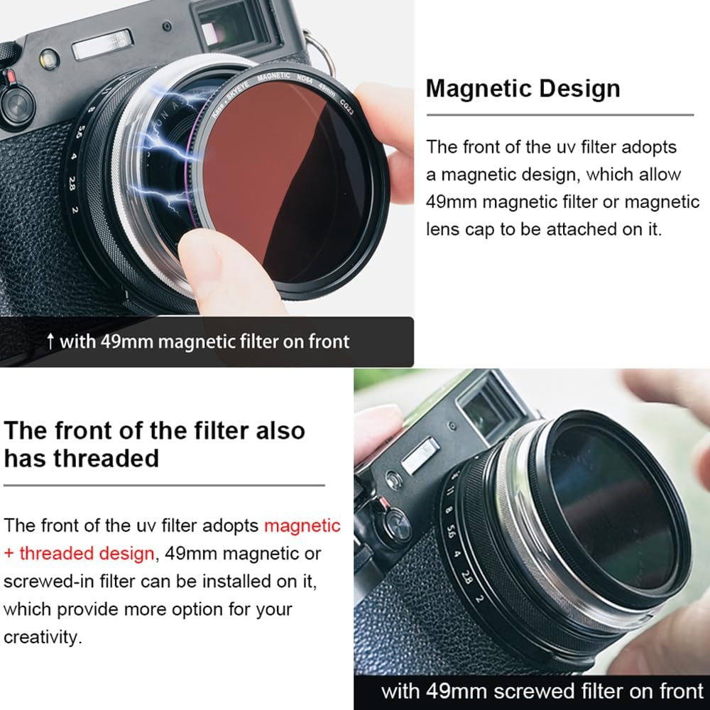 【Conception magnétique et filetée】 L’avant du filtre UV adopte une conception magnétique + filetée, qui permet d’installer un filtre magnétique/capuchon d’objectif de 49 mm ou un filtre à visser dessus. Il offre plus d’options pour votre créativité.