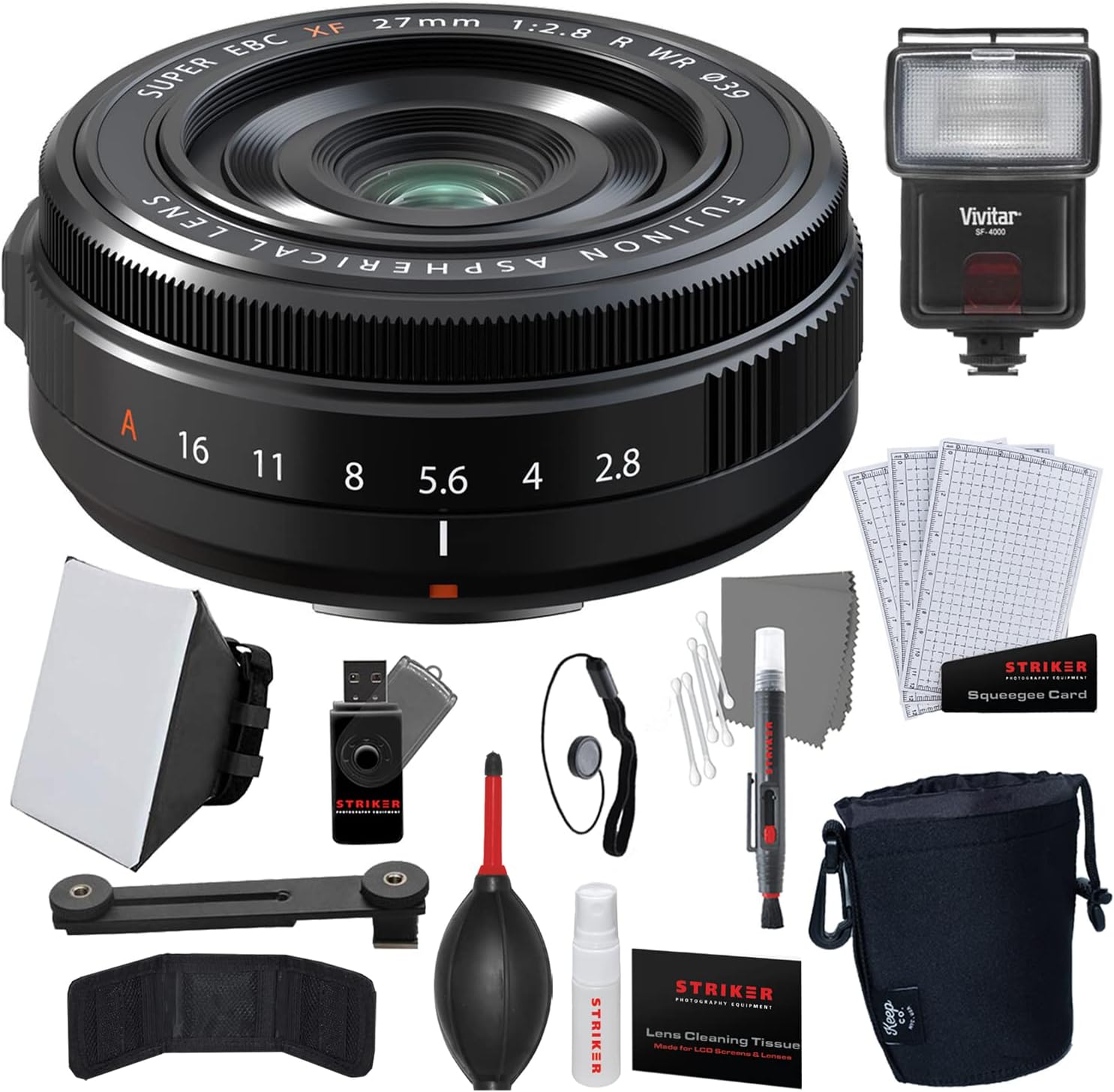 Ce lot comprend : un objectif Fujifilm XF 27 mm f/2,8 R WR + un kit de démarrage photo Striker Deluxe (11 pièces) + une pochette pour objectif Keep Co. – Medium